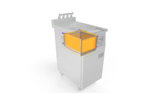In standard fryers, the resistance groups are located inside the chamber and come into direct contact with the oil. Because the heat source (resistor) that heats the oil has a smaller surface area compared to the mass of the oil than the EcoFry, the overheated source operating within the oil naturally burns the oil and causes the production of polar substances. This is not the case with the EcoFry, because the heat source, spread over a larger surface area, operates at temperatures closer to the oil temperature, heating the oil more uniformly.